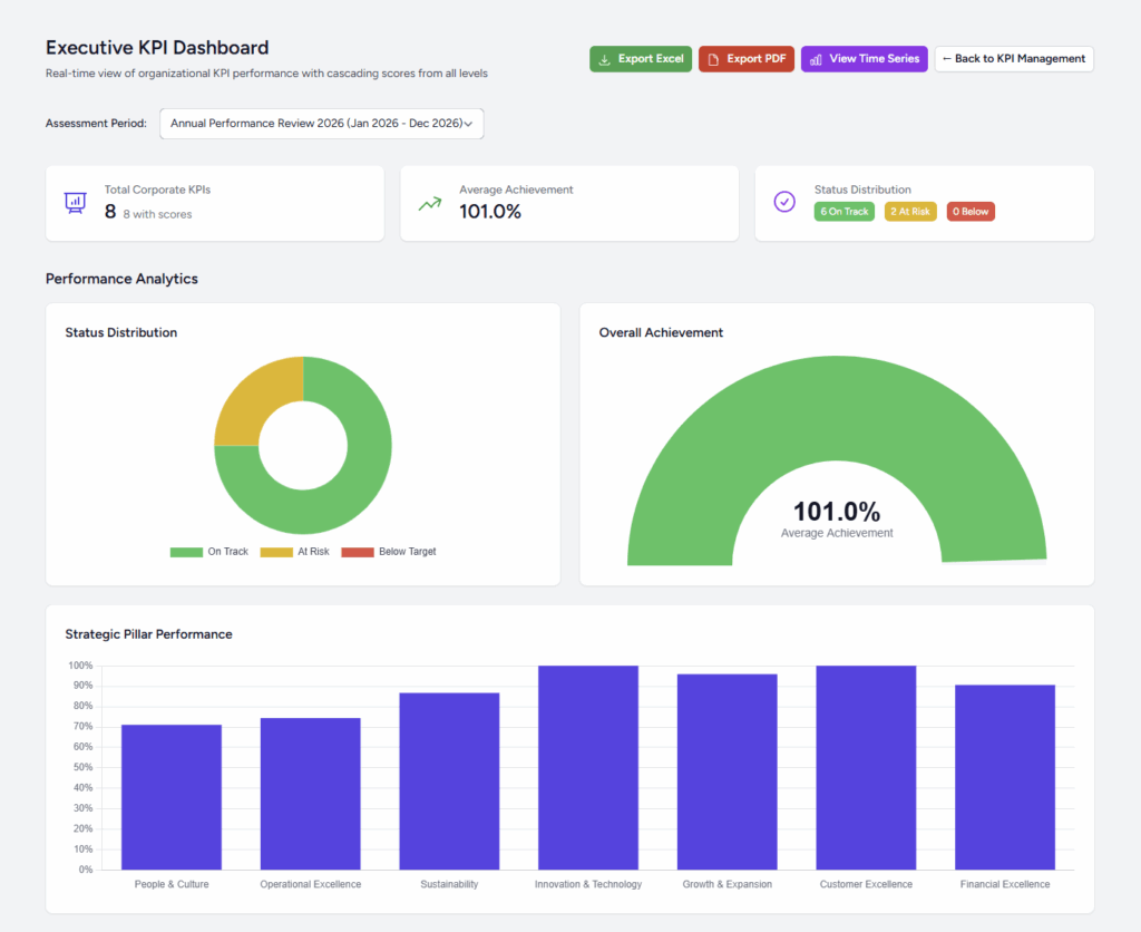- กราฟ Status Distribution (On Track / At Risk / Below Target)
