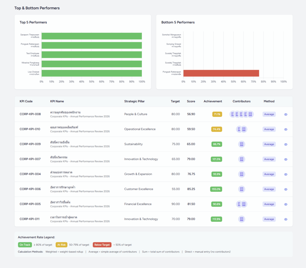 ผู้บริหารสามารถดูค่าเฉลี่ยความสำเร็จขององค์กร และเจาะลึกลงไปถึงผลงานของแต่ละแผนกหรือพนักงานได้ในหน้าจอเดียว